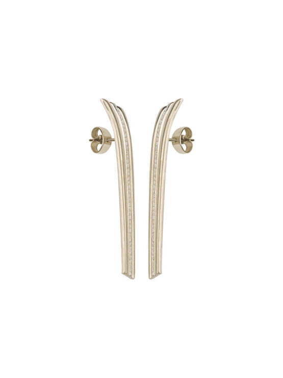 MYCENAEAN collection by POLINA ELLIS, is inspired by the dynamic lines of ancient Greek Mycenaean motifs. This 18kt GOLD, imposing earrings, gilded with white brilliant cut diamonds are a distinctive statement pair of earrings that emanate the power of a very important culture.