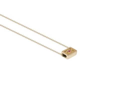 The EYE charm created by POLINA ELLIS, a symbol of protection. This delicate 14kt gold necklace is aligned with the designer’s geometrical stylistic identity of simple, clean lines: The eye is engraved and is accentuated by a ruby in the middle, constituting a fine and elegant timeless piece.